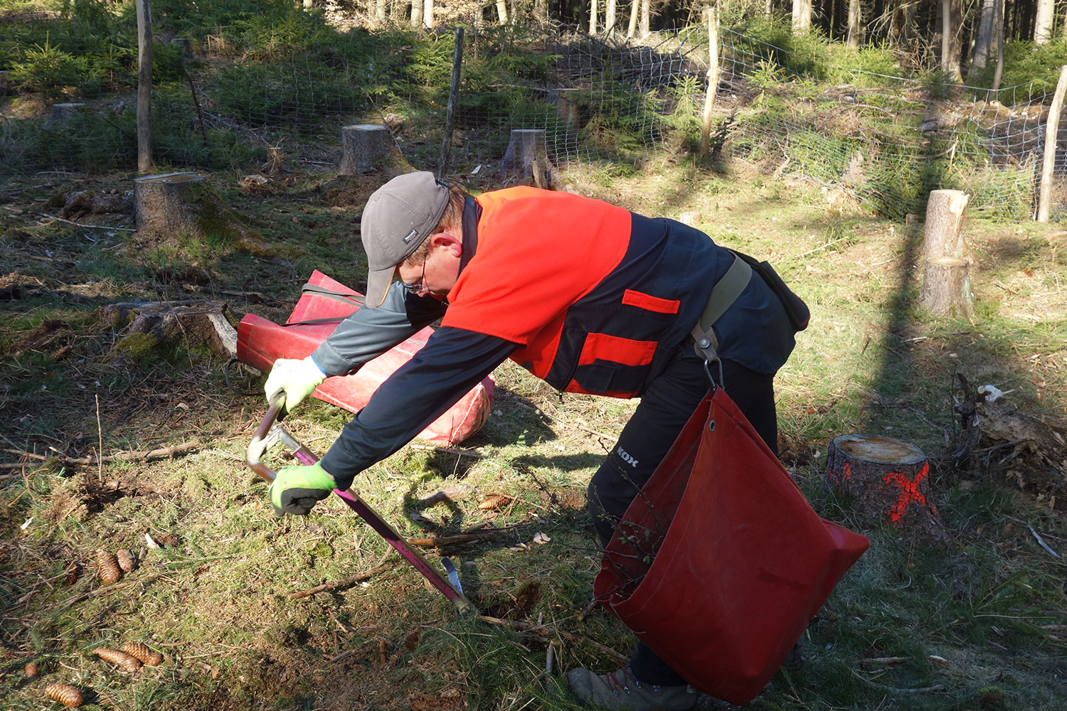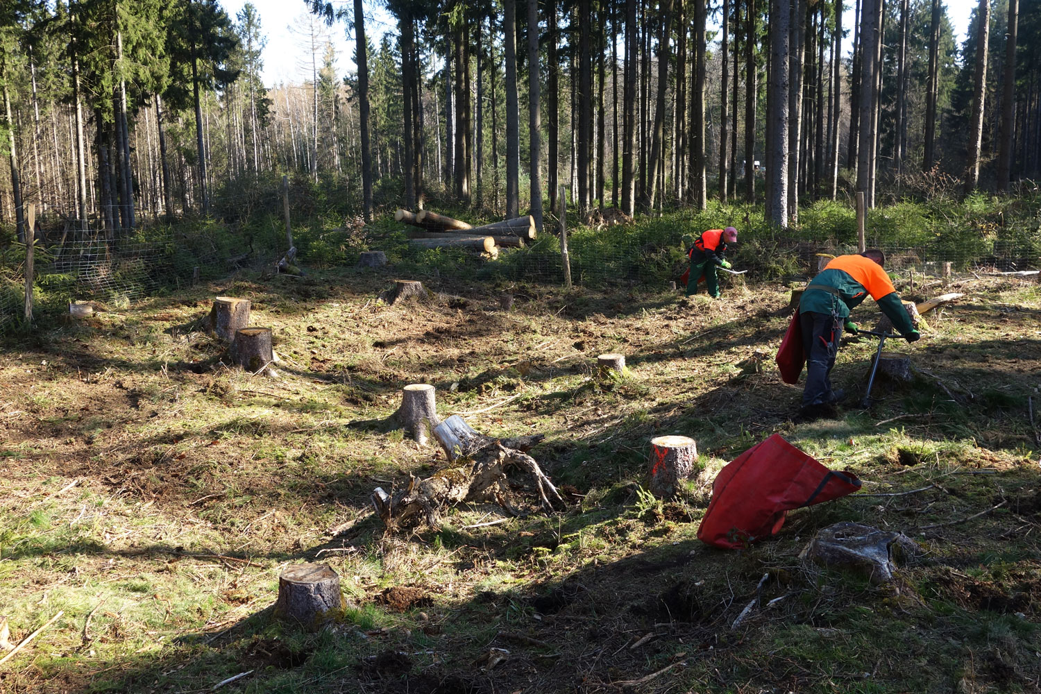 Insbesondere reine Nadelbaumbestände wurden und werden weiterhin durch Wassermangel und Borkenkäfer existentiell bedroht. Wir versuchen, die Schäden durch einen Umbau dieser Bestände hin zu artenreichen Mischwäldern abzumildern und so den künftigen Wald klimastabiler wieder aufzuforsten.