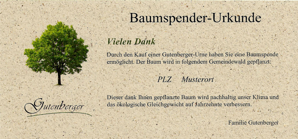Damit unsere Kinder den Wald genauso erleben dürfen wie wir ihn lieben, möchten wir unseren Beitrag leisten. In Zusammenarbeit mit den heimischen Förstern pflanzen wir ab Januar 2020 für jede verkaufte Gutenberger-Urne einen Baum und unterstützen somit die Aufforstung der Wälder.