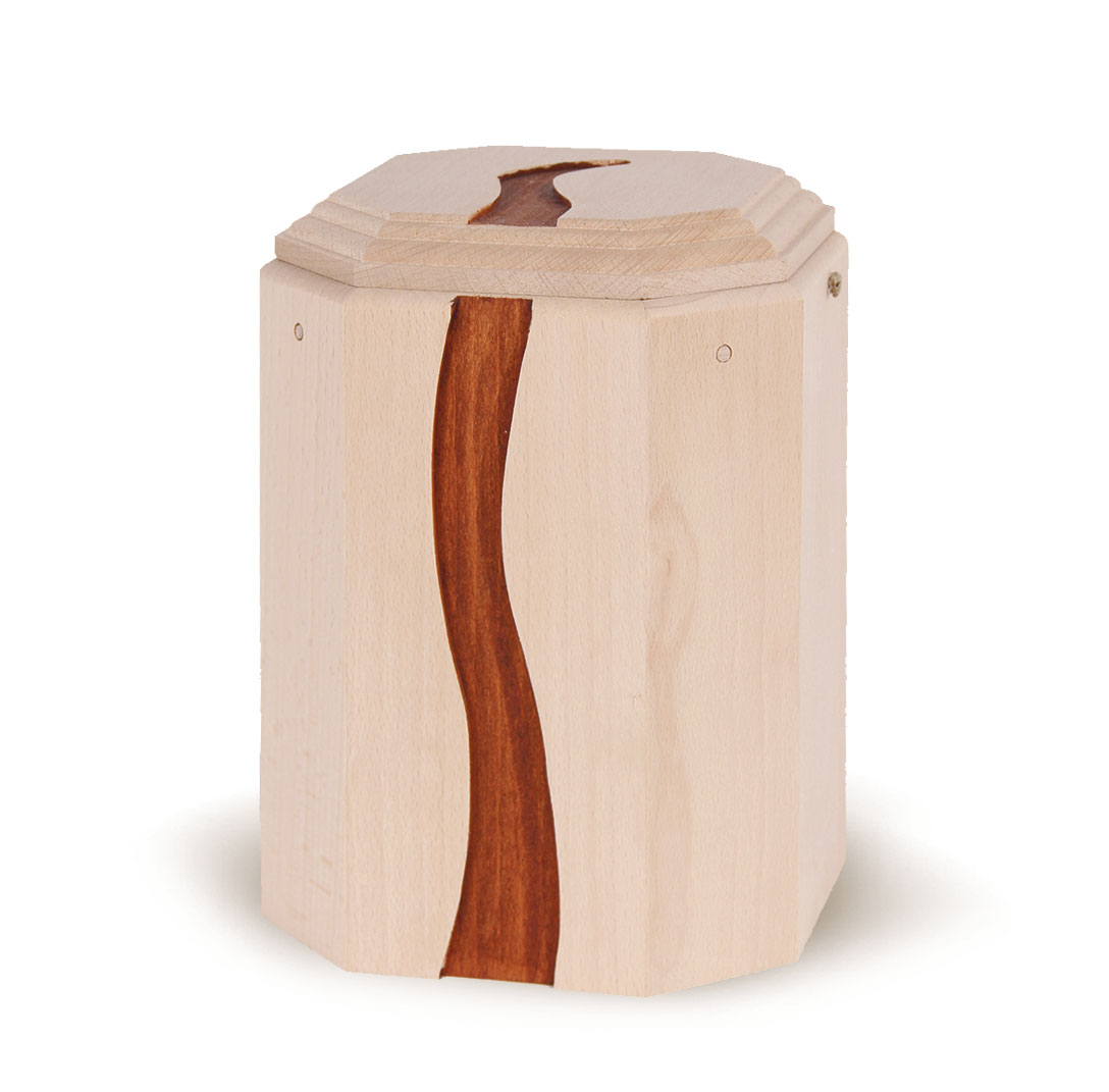 Die gefräste Lebenslinie auf der Urne wird durch Erd- und Naturfarben hinterlegt. Die Naturtöne in Kombination mit dem unbehandelten Holz harmoniert perfekt miteinander.